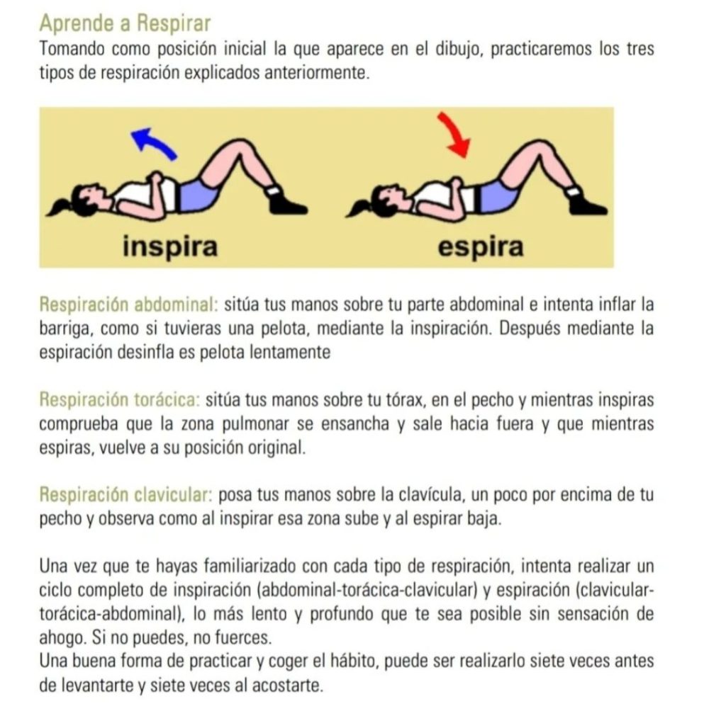 - Respirar con el diafragma es la mejor opción (llevar el aire a nuestro abdomen y no al tórax), produce una respuesta de relajación de nuestro cerebro y cuerpo ayudando a la regeneración de nuestros tejidos. Debemos inspirar por la nariz y exhalar por la boca alargando el tiempo de espiración, sobre todo si realizamos ejercicio físico o nos encontramos en una situación de estrés.